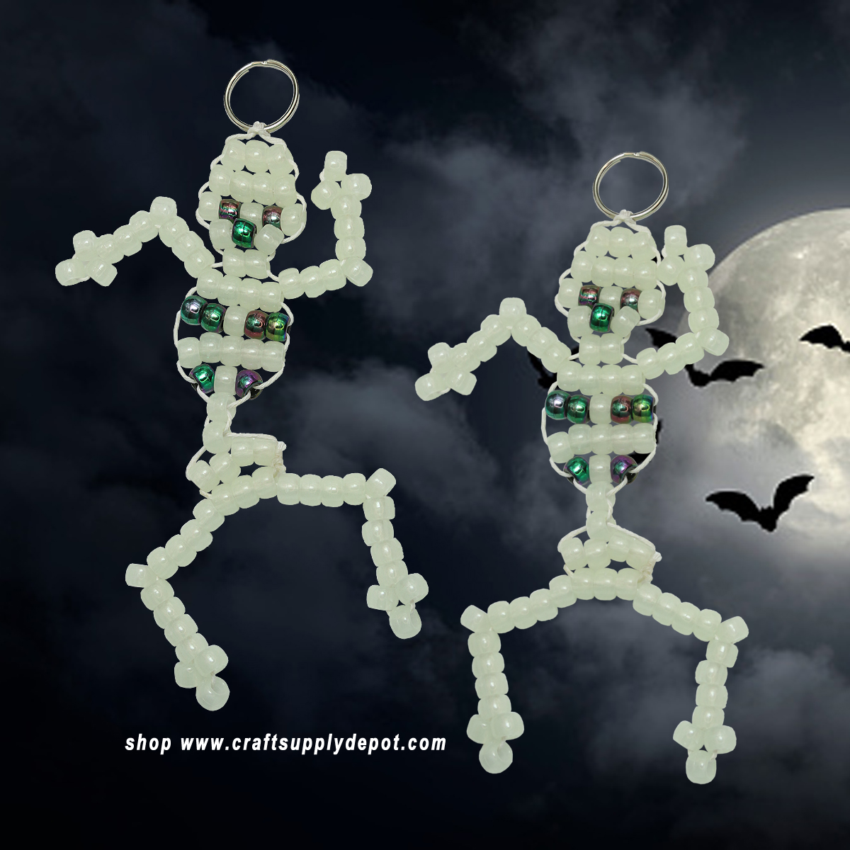 Imagine a string of fluorescent white pony beads forming this wiggly little skeleton. Threaded onto a durable cord, these little guys are ready to hang, dangle, or even become the star of a spooky garland.