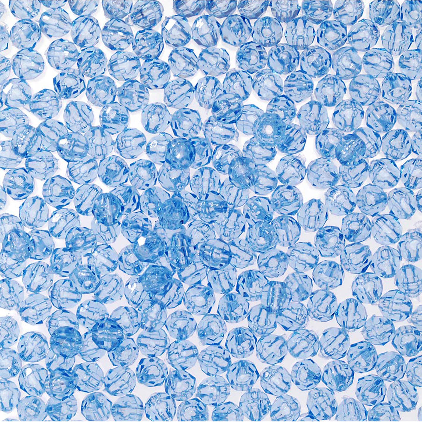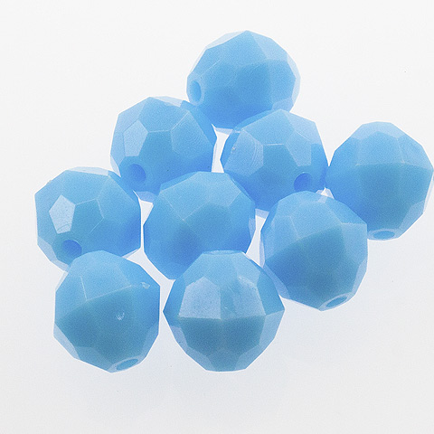 10 mm - BABY BLUE - 144 pc These 10mm faceted beads are an opaque color (light cannot pass through the bead). 10mm beads are a light weight alternative to glass for jewelry making, beading projects, kid's crafts, making fishing lures and more. Combine these faceted plastic beads with bead caps, specialty findings, gold or silver beads and wire to make unique and beautiful bead creations. 10mm beads, 144 pcs per package.
