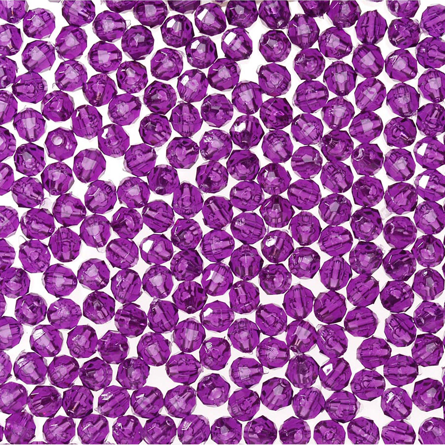10 mm - AMETHYST - 432 pc These 10mm faceted beads are a transparent color (light can be seen through the bead). 10mm beads are a light weight alternative to glass for jewelry making, beading projects, kid's crafts, making fishing lures and more. Combine these faceted plastic beads with bead caps, specialty findings, gold or silver beads and wire to make unique and beautiful bead creations. 10mm beads, 144 pcs per package.