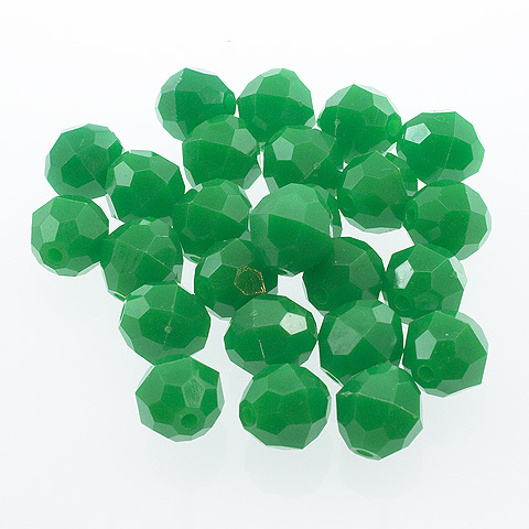 10 mm - GREEN - 72 pc These 10mm faceted beads are an opaque color (light cannot pass through the bead). 10mm beads are a light weight alternative to glass for jewelry making, beading projects, kid's crafts, making fishing lures and more. Combine these faceted plastic beads with bead caps, specialty findings, gold or silver beads and wire to make unique and beautiful bead creations. 10mm beads, 72 pcs per package.