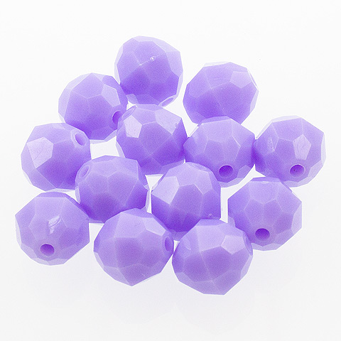 10 mm - LILAC - 72 pc These 10mm faceted beads are an opaque color (light cannot pass through the bead). 10mm beads are a light weight alternative to glass for jewelry making, beading projects, kid's crafts, making fishing lures and more. Combine these faceted plastic beads with bead caps, specialty findings, gold or silver beads and wire to make unique and beautiful bead creations. 10mm beads, 72 pcs per package.