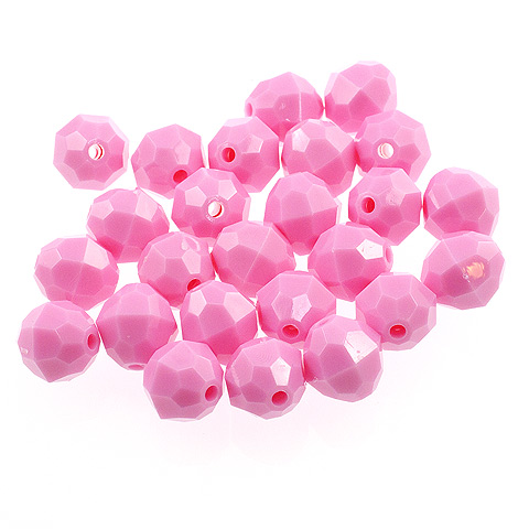 10 mm - PINK - 72 pc These 10mm faceted beads are an opaque color (light cannot pass through the bead). 10mm beads are a light weight alternative to glass for jewelry making, beading projects, kid's crafts, making fishing lures and more. Combine these faceted plastic beads with bead caps, specialty findings, gold or silver beads and wire to make unique and beautiful bead creations. 10mm beads, 72 pcs per package.