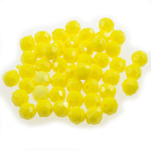 10 mm - YELLOW - 72 pc These 10mm faceted beads are an opaque color (light cannot pass through the bead). 10mm beads are a light weight alternative to glass for jewelry making, beading projects, kid's crafts, making fishing lures and more. Combine these faceted plastic beads with bead caps, specialty findings, gold or silver beads and wire to make unique and beautiful bead creations. 10mm beads, 72 pcs per package.