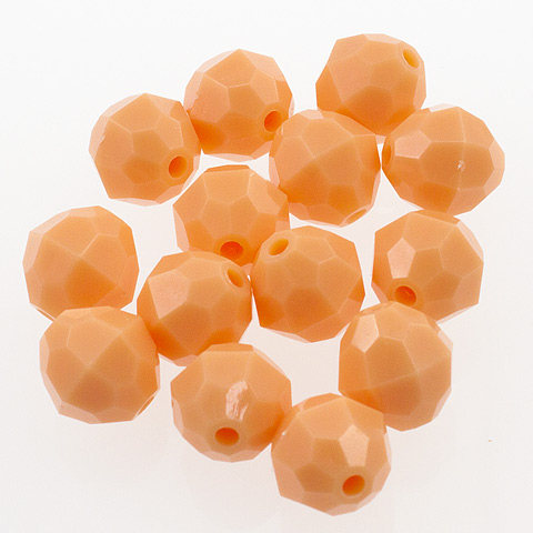 10 mm - PEACH - 72 pc These 10mm faceted beads are an opaque color (light cannot pass through the bead). 10mm beads are a light weight alternative to glass for jewelry making, beading projects, kid's crafts, making fishing lures and more. Combine these faceted plastic beads with bead caps, specialty findings, gold or silver beads and wire to make unique and beautiful bead creations. 10mm beads, 72 pcs per package.