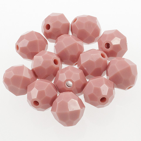10 mm - DUSTY ROSE - 72 pc These 10mm faceted beads are an opaque color (light cannot pass through the bead). 10mm beads are a light weight alternative to glass for jewelry making, beading projects, kid's crafts, making fishing lures and more. Combine these faceted plastic beads with bead caps, specialty findings, gold or silver beads and wire to make unique and beautiful bead creations. 10mm beads, 72 pcs per package.