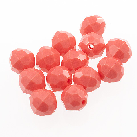 10 mm - CORAL - 72 pc These 10mm faceted beads are an opaque color (light cannot pass through the bead). 10mm beads are a light weight alternative to glass for jewelry making, beading projects, kid's crafts, making fishing lures and more. Combine these faceted plastic beads with bead caps, specialty findings, gold or silver beads and wire to make unique and beautiful bead creations. 10mm beads, 72 pcs per package.