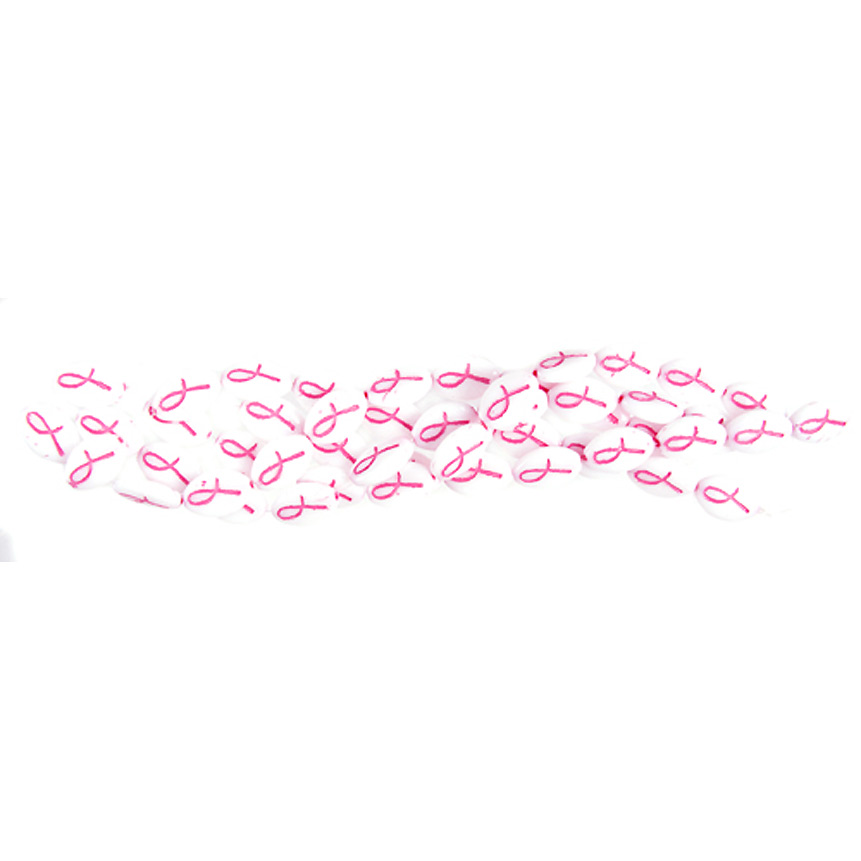11mm x 16mm - - 10 pc These oval, flat beads with the pink ribbons are perfect for breast cancer awareness campaigns. Create bracelets, pins, key chains and more! Beads are white with pink painted ribbons.