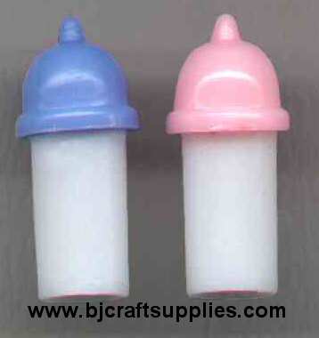 Soft Plastic baby bottles look great in your shower table decorations, or to dress up a bow on a shower gift. 3 Pink and 3 Blue per pkg