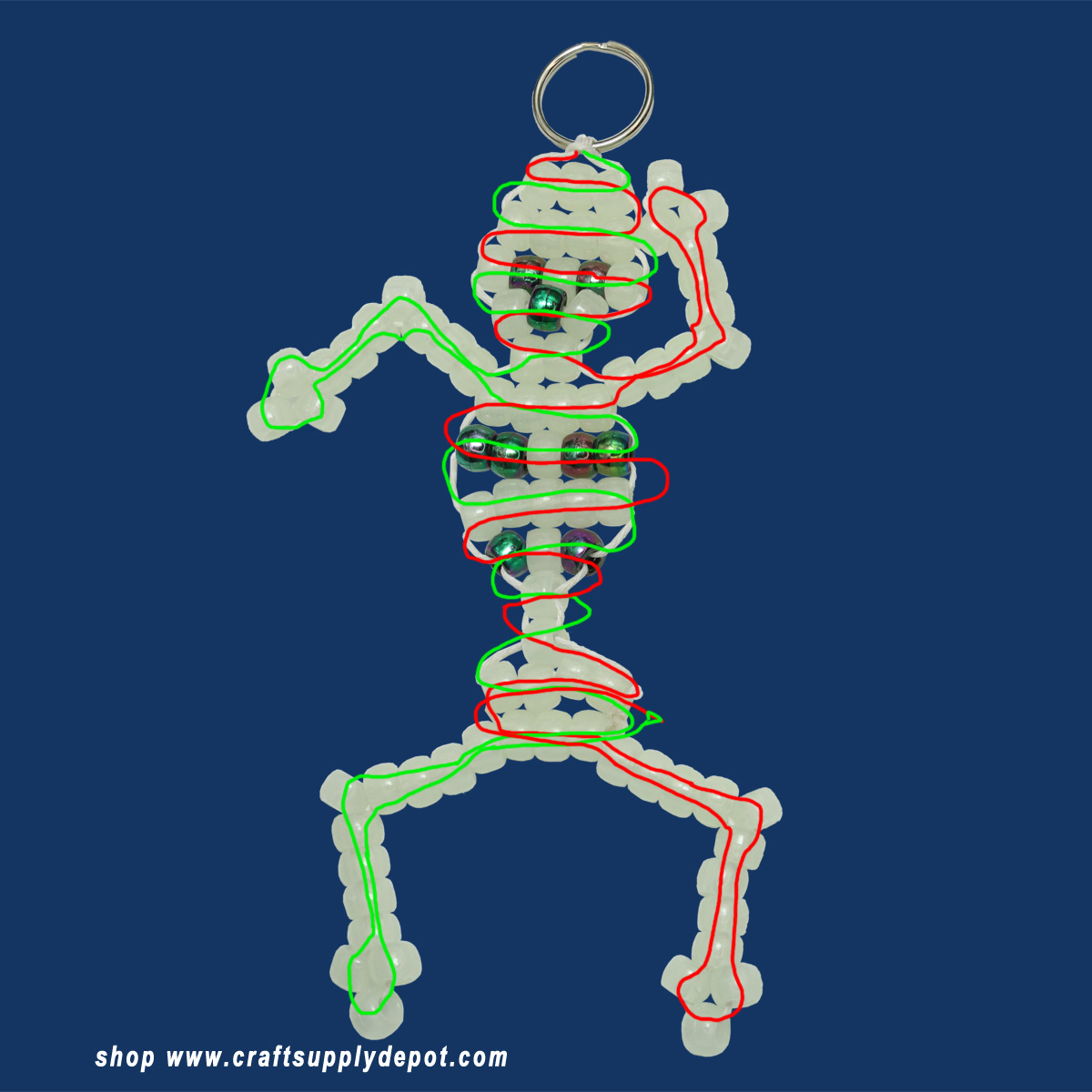 Imagine a string of fluorescent white pony beads forming this wiggly little skeleton. Threaded onto a durable cord, these little guys are ready to hang, dangle, or even become the star of a spooky garland.